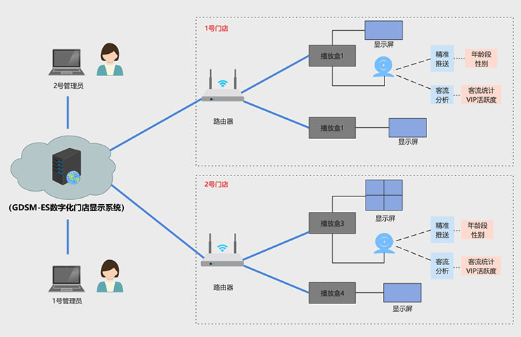 该客户为宁波地区零售门店,在一段时间内,客户发现门店销售额持续下滑,但是不知道原因出在哪里,到底是消费者减少,还是广告推送出现问题,亦或是其他原因,客户没有头绪,球王会·(体育)科技数据化门店显示系统完美的解决了客户痛点,方案拓扑图如下: