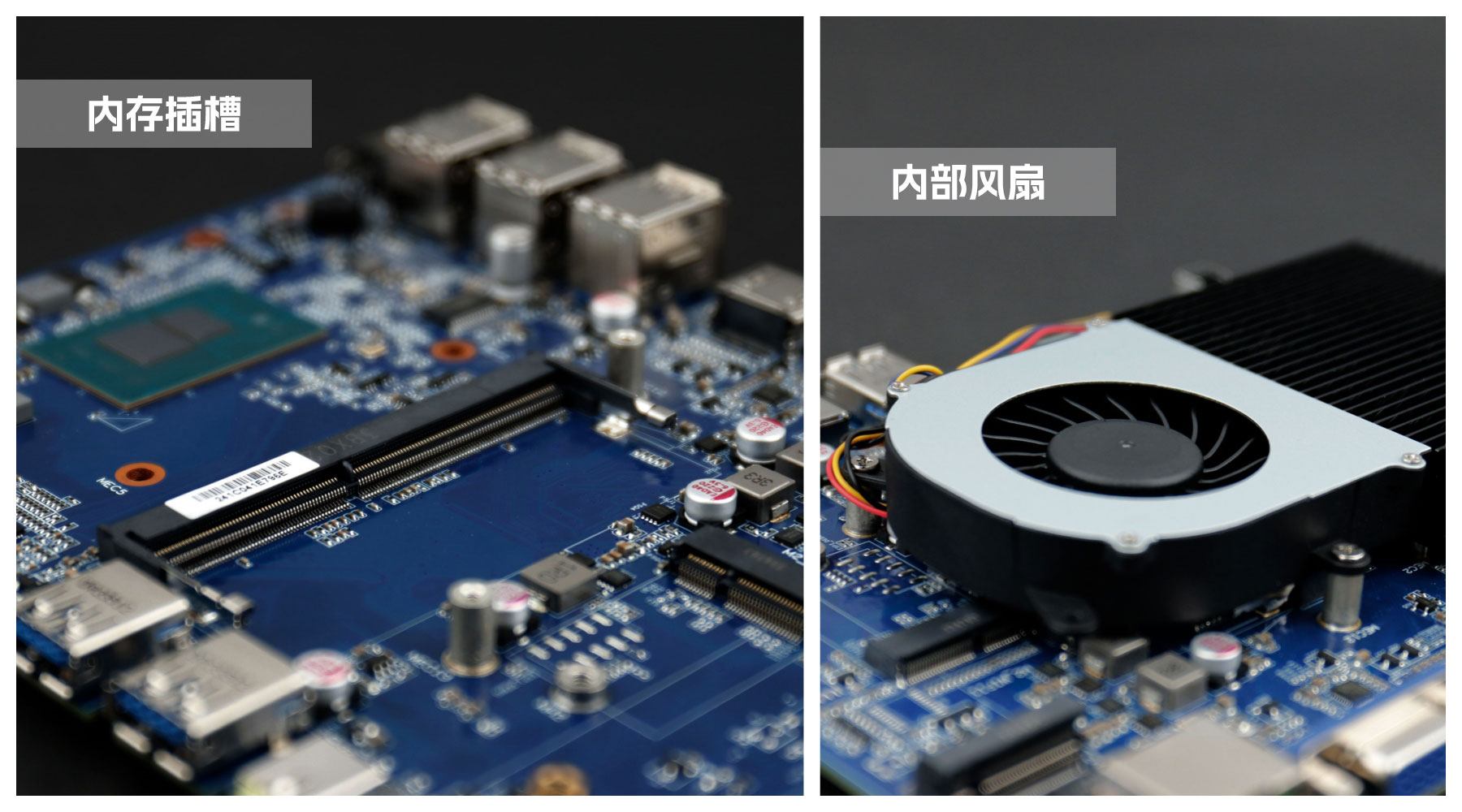 球王会·(体育)桌面云终端Y-BOX S2主板中部是内存插槽,采用单通道笔记本内存槽设计,最大支持容量可达32GB,最高支持DDR4-3200MHz频率,横插的形式可以减少主板的占用体积,使整体机身更紧凑,内存顶部的风扇起到高效散热的作用。