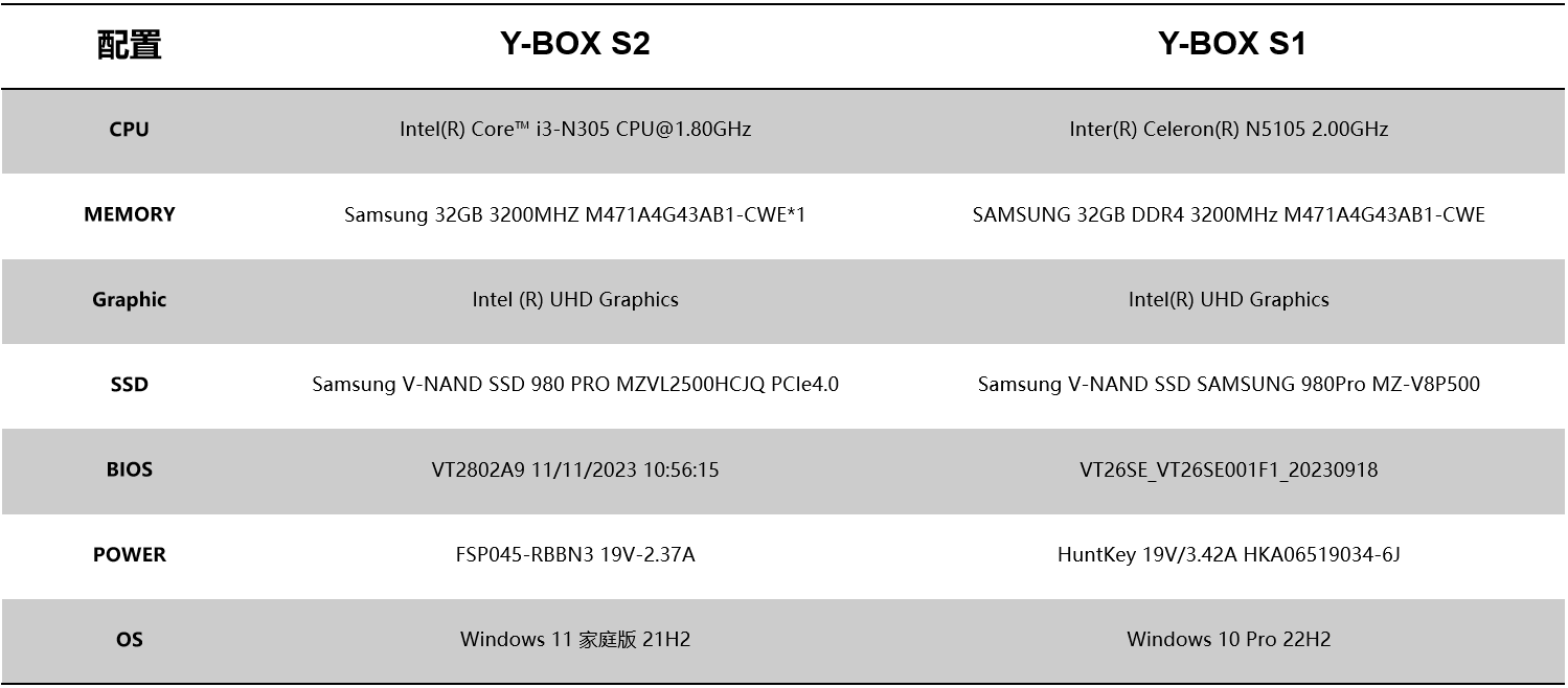 针对桌面云终端Y-BOX S2的测试项目中,最值得关注的是性能测试的跑分数据和稳定性测试内容,这能直观影响主机在使用过程中的稳定性和用户的使用体验。针对性能测试,球王会选择了将Y-BOX S2与前一款更迭产品Y-BOX S1进行对比分析,Y-BOX S2支持Intel® Alder lake-N处理器,Y-BOX S1支持Intel® Jasper Lake,并分别选取了以下配置: