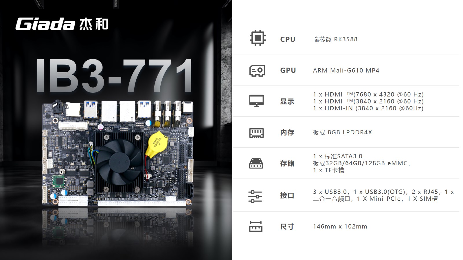 球王会·(体育)工业级ARM主板IB3-771采用瑞芯微RK3588处理器,内置G610 MP4 GPU,拥有6 TOPS算力的NPU,支持8K视频硬件解码编码及多摄像头输入,支持eDP/DP/ HDMI2.1/MIPI 多种显示接口。