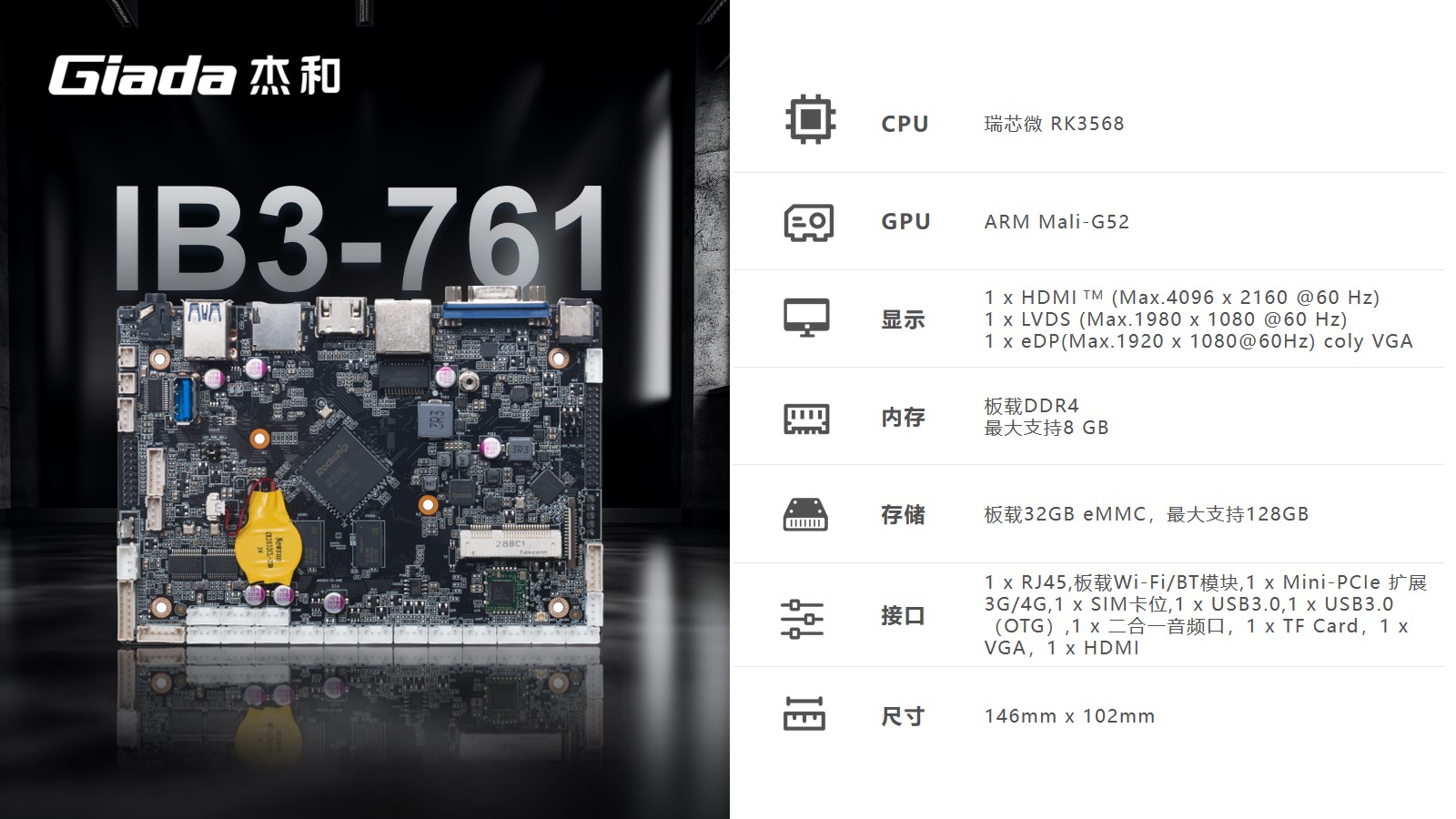 球王会·(体育)工业级ARM主板IB3-761基于瑞芯微RK3568四核64位处理器开发。内置1TOPS算力的NPU,满足轻量级端侧AI计算应用。
