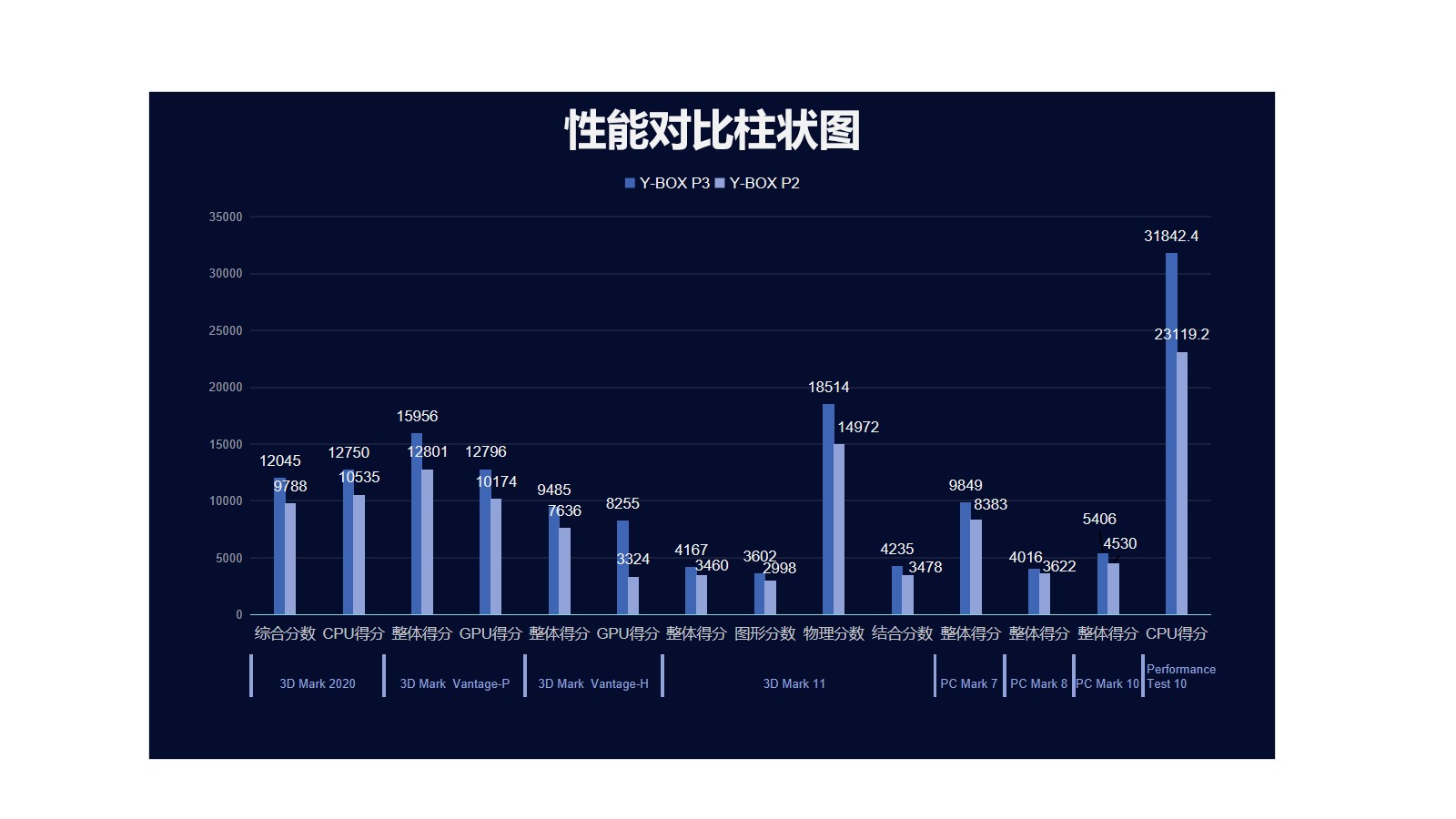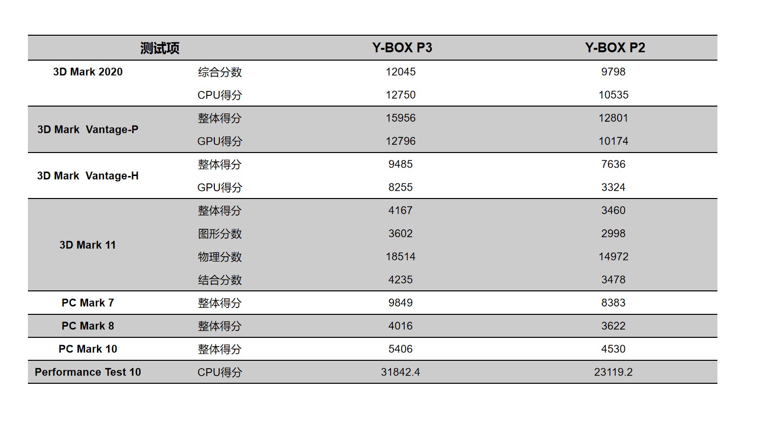 球王会来具体看看各个测试项目的跑分情况,球王会分别用3D Mark、PC Mark以及Performance 10等不同系列不同软件进行跑分,测试项目涵盖显示性能测试、系统性能测试、CPU性能测试等。通过下面的表格及柱状图可以看出,球王会·(体育)桌面云终端Y-BOX P3的数据在各项性能上都得到了大幅度提升。
