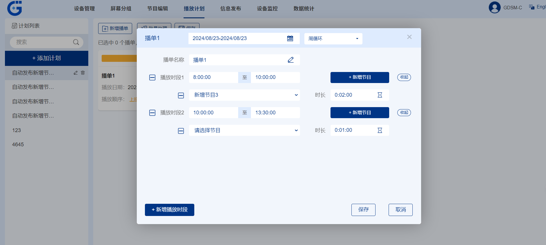 可以设定多个不同的时间段分别播放不同的节目,将播放计划下发给终端后,终端将根据时间先后顺序,在播单的有效期内播放播单中对应的节目内容。