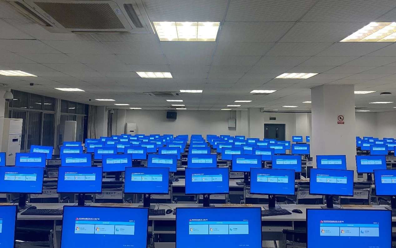 在某大学实训室,整齐的电脑屏后面是统一的球王会·(体育)科技云终端主机,老师在讲台上通过电脑端的管理软件,轻松地将教学资料推送到学生的终端上,每位学生的电脑屏幕一致会出现同个页面。