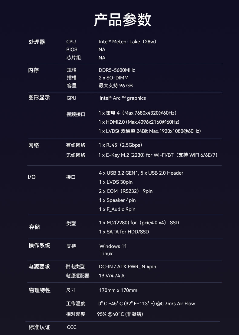 CB4-411支持英特尔Ultra5、Ultra7、Ultra9H系列处理器,支持本地AI计算,拥有34TOPS算力、DDR5高速内存、雷电4接口、2.5 GbE 以太网等功能特性。还在主板功能上进行改良,增加一键静音、一键熄屏、一键音量加减的功能。