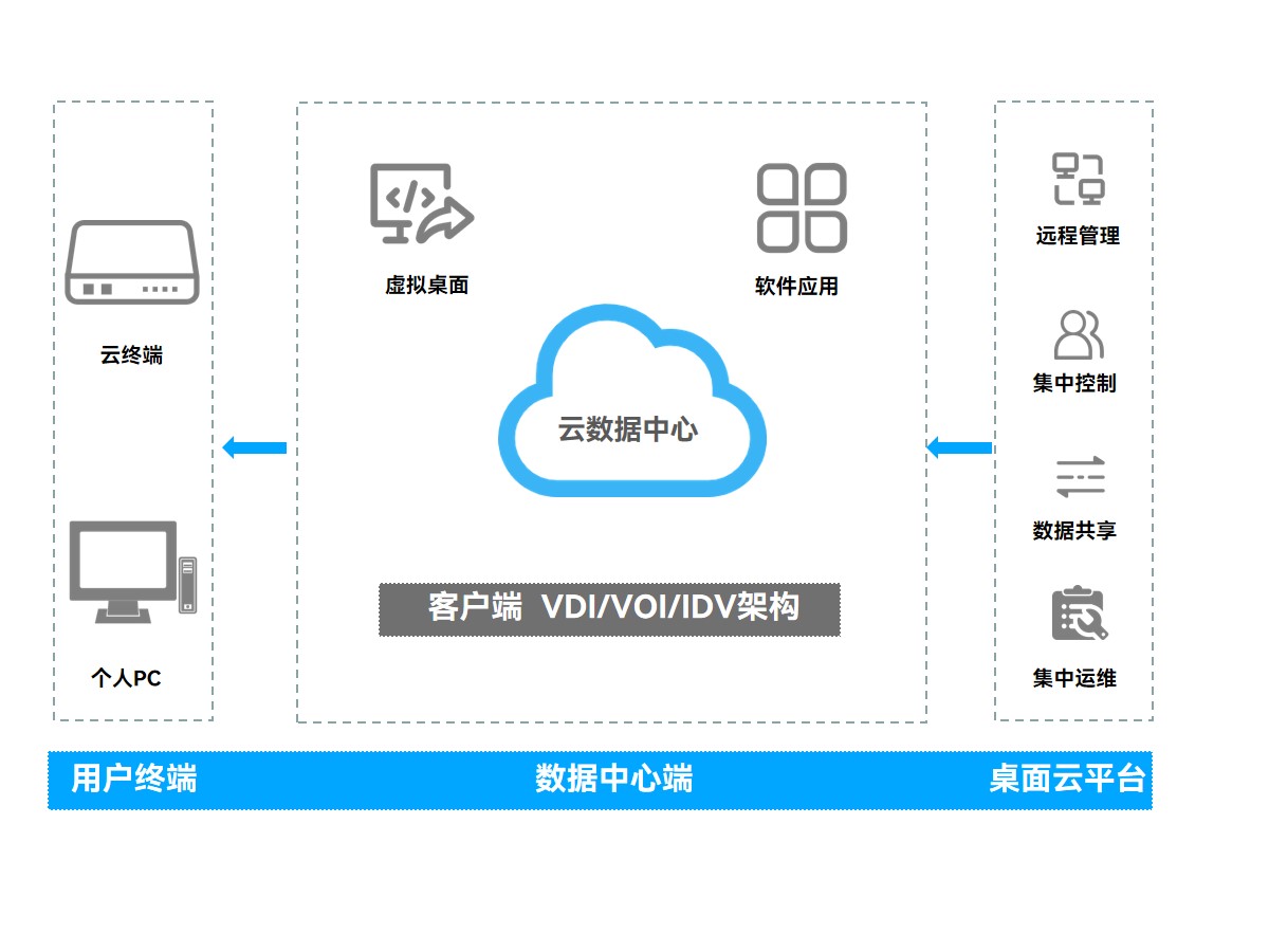 综合以上困境,该地测绘地理信息局决定采用球王会·(体育)科技云终端方案,该方案依托云计算技术,通过特殊的架构将数据和应用程序存储在云端而非本地,对每台终端统一做到管理与下发、安全补丁更新、软件安装,自上而下从结构上整合终端资源,降低系统建设、运行成本。