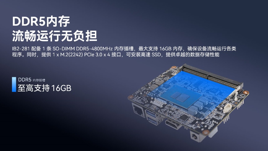 IB2-281采用intel®Alder Lake-N平台,支持N100处理器,最大睿频频率可达3.4GHz,可满足数字标牌和自助零售终端交互式体验需求。支持DDR5内存,配备1条SO-DIMM DDR5- 4800MHz内存插槽,至高支持16GB内存,能够确保互动式电子价签实时更新商品价格、促销信息,为顾客提供更多产品详情。