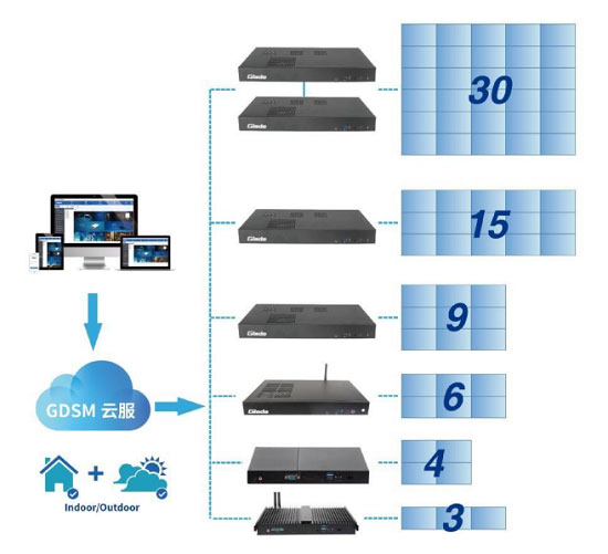 与常规分屏展示方案不同,在球王会·(体育)拼接控制器的视频输出能力和GDSM系统分组设置能力的组合下,店铺可以随时调整的拼接放置样式;快速设置屏幕的拼接、分组方式;快速编辑制作并发布信息;是一套安装部署迅速、内容调整迅速、更新反馈迅速的一体化信息发布方案。