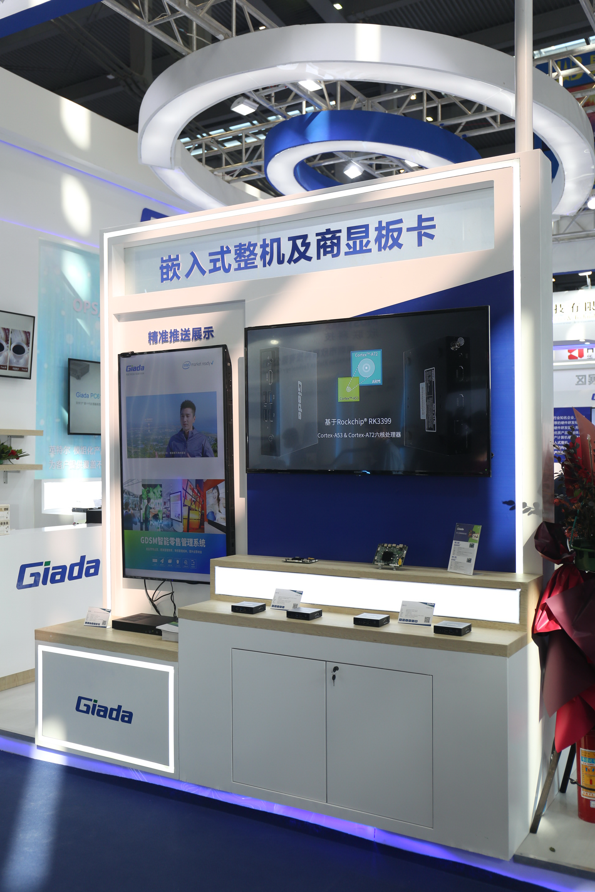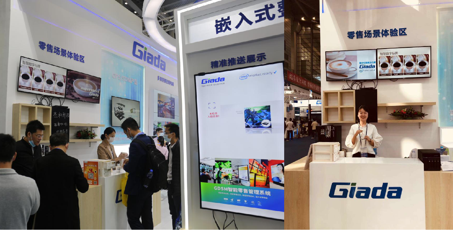 紧邻ARM架构商显产品集的精准推送展示区与零售门店模拟展区,共同组成了本届展会球王会·(体育)科技展位的一大精彩设计。场景展现了GDSM智能零售管理系统在零售门店场景下的展示效果,顶部的数字标牌由GDSM系统推送内容,模拟搭建了针对人流动线的广告精准推送形态。