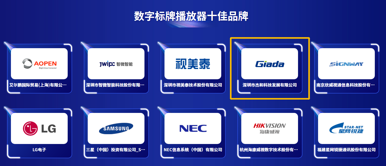 Giada球王会·(体育)科技凭借突出的市场竞争力、强劲的产品创新力、卓越的产品成长力、领先的品牌影响力,从众多候选企业中脱颖而出,斩获“优秀多媒体信息发布系统品牌大奖”、“优秀播放器品牌大奖”两项荣誉。Giada球王会·(体育)科技已连续四年登上领奖台。