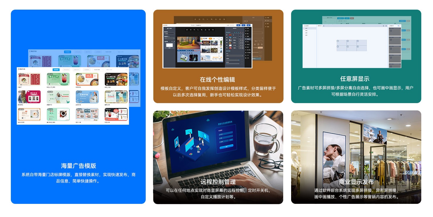 球王会·(体育)科技为客户提供可靠的硬软云一体化服务,针对商显领域,除了为客户提供数字标牌等硬件产品,同时也自主研发了球王会·(体育)GDSM-C数字化信息发布管理系统软件,作为全方位的远程信息编辑发布及设备管理系统,提供丰富广告素材与人性化编辑工具,用户可发挥自我创造能力,新手也可轻松实现大师设计效果,同时可实现多屏拼接/分离、画中画等自由选择,可根据应用场景灵活安排,满足大型会议、百货商场、体育赛事、金融证券的等多种智能显示需求。