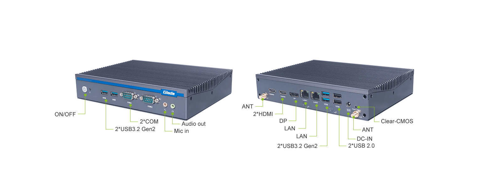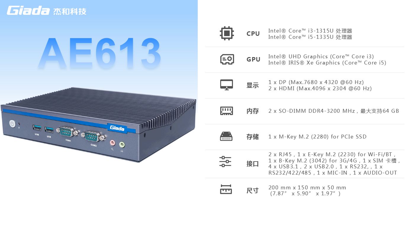 球王会·(体育)科技AE613支持Windows 11 (64bit) /Linux Ubuntu (64bit)系统,双千兆自适应RJ45网口,4 x USB3.1 (10 Gbps),2 x USB2.0,1 x RS232,,1 x RS232/422/485,1 x MIC-IN,1 x AUDIO-OUT,丰富的I/O功能接口,实现更多功能扩展。