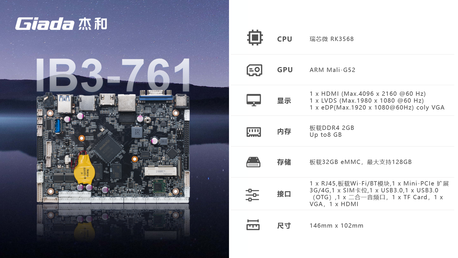 球王会·(体育)ARM主板IB3-761基于瑞芯微RK3568四核64位处理器开发,可实现多任务并行、更大数据集的高效处理,丰富的接口,具有性能强、内存大、集成度高、扩展能力强等特点,在处理速度和图形处理能力方面都表现出色,可广泛应用于物联网网关、边缘存储、工控平板、工业检测、工控盒、自助终端、云终端、车载中控、机器人等行业定制市场。