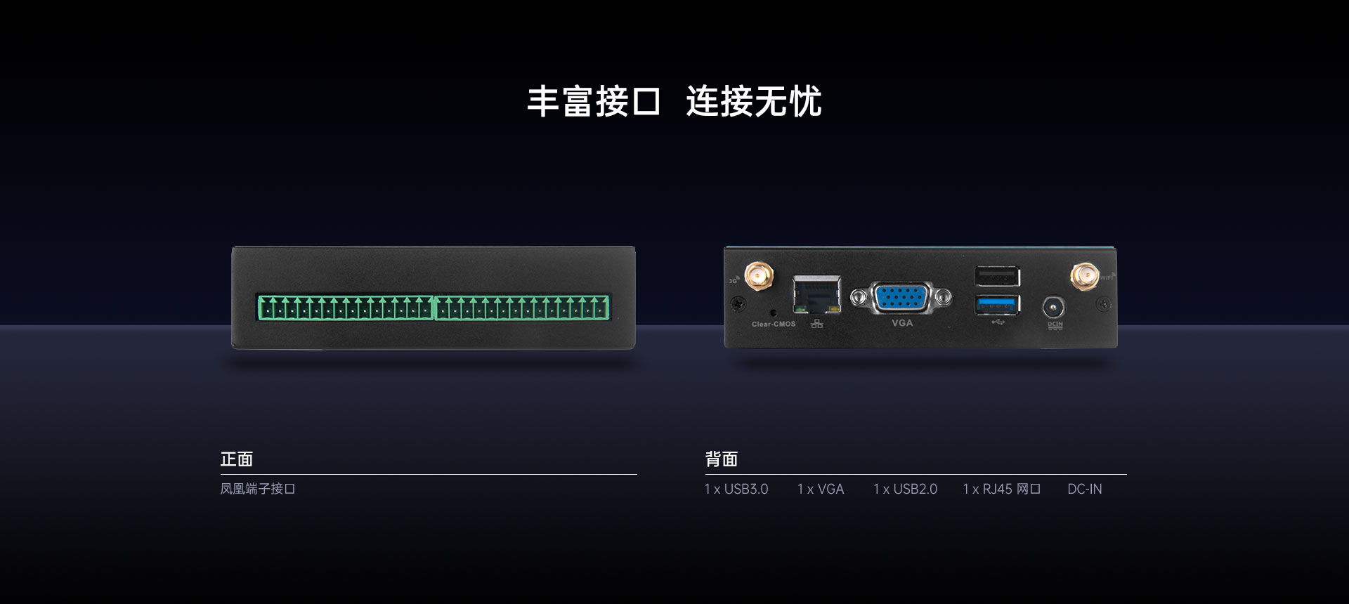 | 凤凰端口 | 共28pin端子,从左到右分别是TTL(3PIN)、I2C (4PIN) GPIO(1PIN)*2、USB(4PIN)、TTL(3PIN)*2、RS485/RS422/RS232(9PIN) | |